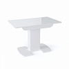 Небольшой раскладной стол для кухни. Каркас – качественные ДСП, столешница прямоугольной формы из МДФ и матового или глянцевого закаленного стекла имеет размер 110 см, легко раскладывается до 140 см. Опирается стол на одну устойчивую ногу, переходящие в две плоские опоры на полу, что гарантирует устойчивость и надежность конструкции.