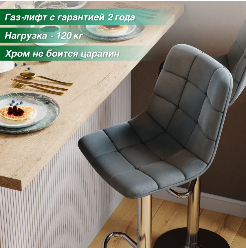 И это всё то же мягкое сиденье Чили с обивкой из премиум-велюра. Износостойкий (45 тысяч циклов по Мартиндейлу на износ), бархатный и приятный на ощупь, он разительно контрастирует с искусственной кожей, которая так популярна в барных стульях. При этом в практичности наш велюр не уступает экокоже. Любое загрязнение легко очищается влажной тряпочкой в мыльном растворе.